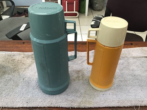 Two Vintage Plastic THERMOS Narrow Neck Bottle 100F & Food Jar 75F Filler w/Lid